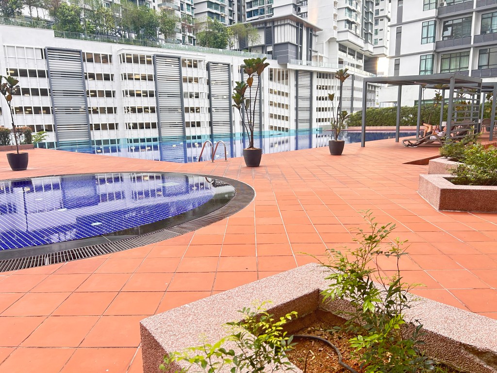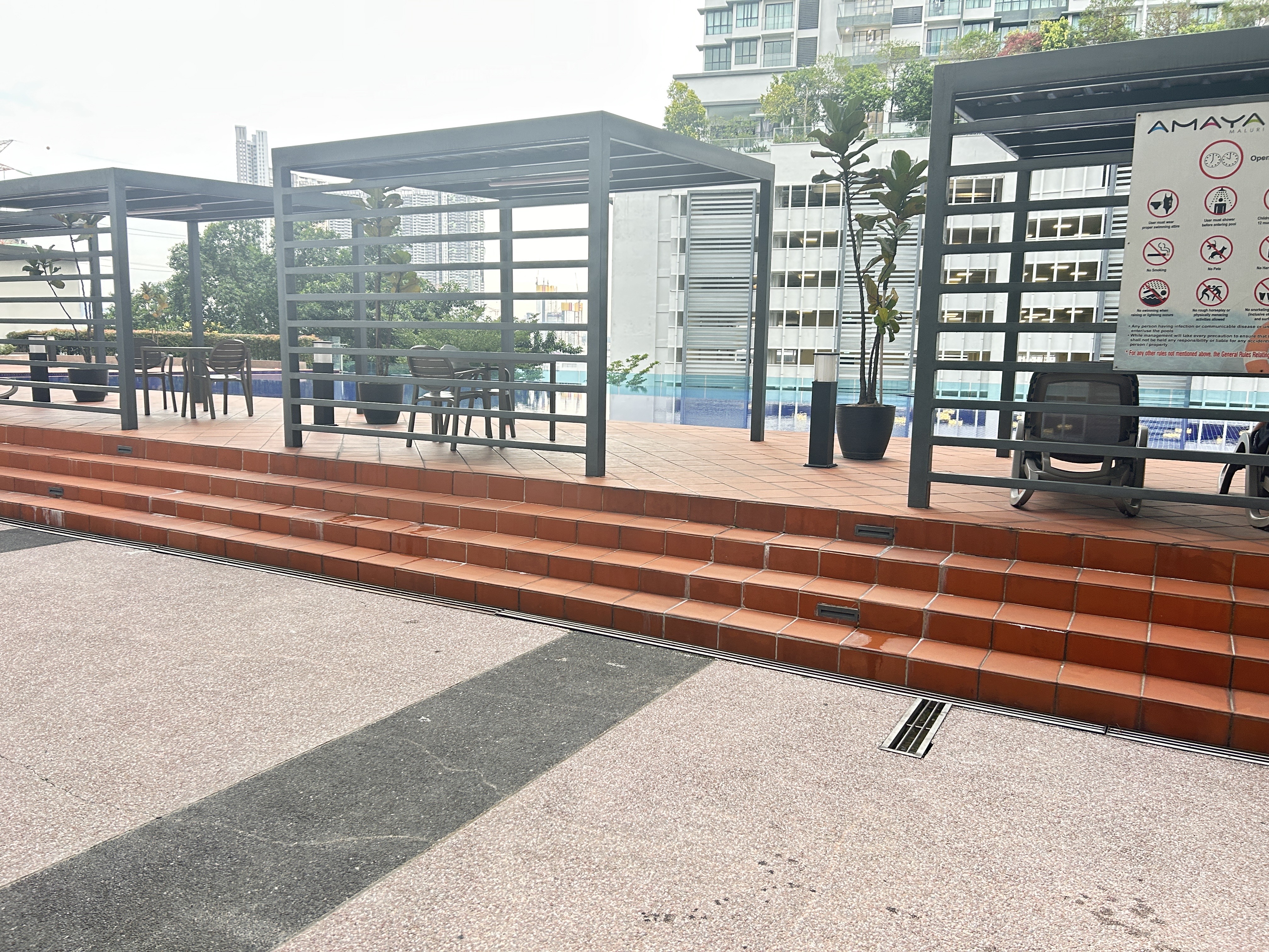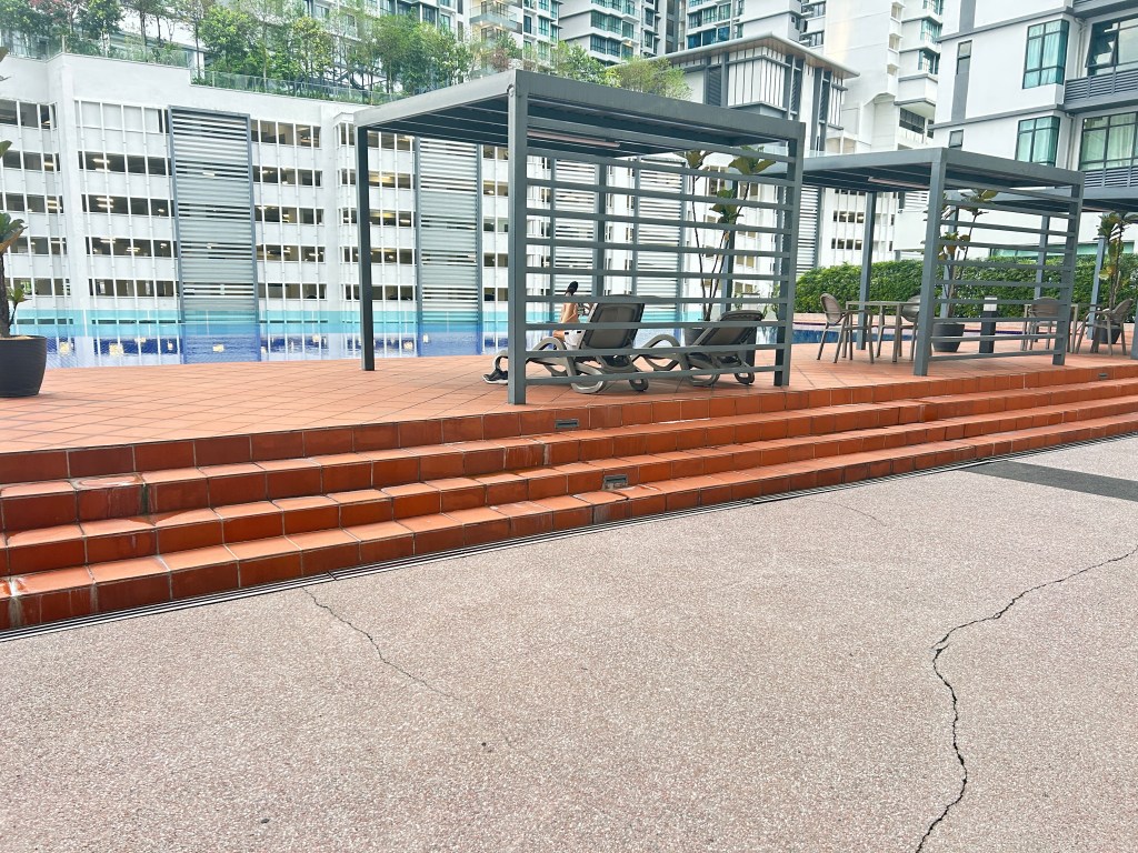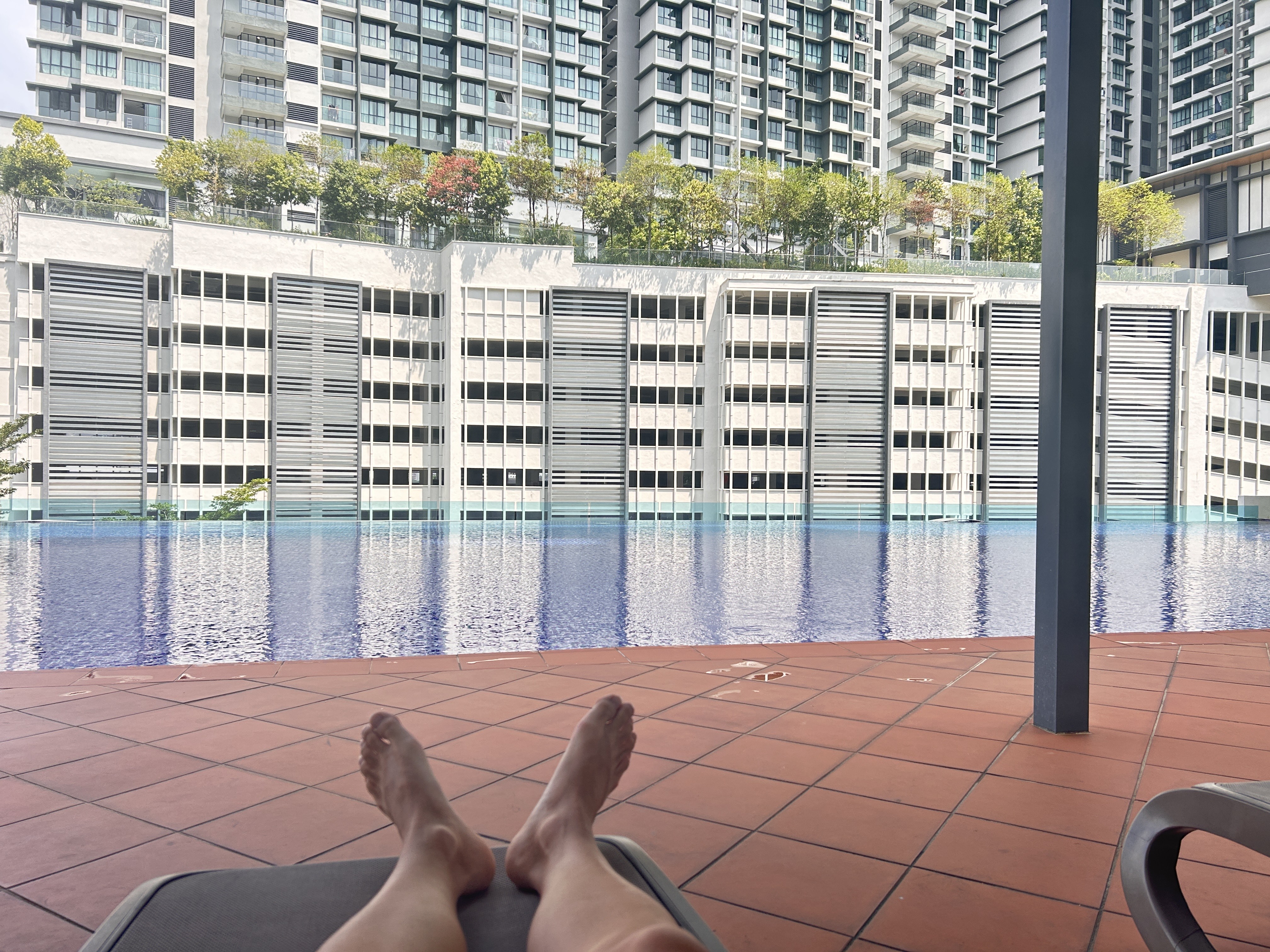 The air carries a faint smell of chlorine from the pool, mixed with floral notes and the warm aroma of someone’s dinner cooking in a nearby unit. That strange combination of scents tickles my nose and makes me feel strangely nostalgic, even if I don’t know why. I usually come here with a book, or play some quiet music. Sometimes I just close my eyes and listen to the sound of the wind. No one bothers me here—and honestly, I don’t want them to. This is the one place where doing “nothing” feels like a luxury.